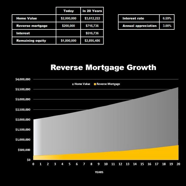 Let’s look at a 75-year-old widow living in an older home worth about $2 million. Suppose she needs $200,000 to pay off debt and renovate her home to make it more senior-friendly.