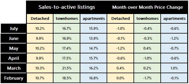 As you can see from the table below, the sales-to-active listings (STAL) ratio for detached homes and apartments rose slightly. The STAL ratio measures supply and demand in the real estate market: an increasing ratio means sales are growing faster than total inventory. While this is a positive sign, it’s starting from a very low base. Demand remains weak, and in fact, prices fell across all categories in July. It’s still very much a buyer’s market—especially for condos—given that another 3,000 units were completed in June.