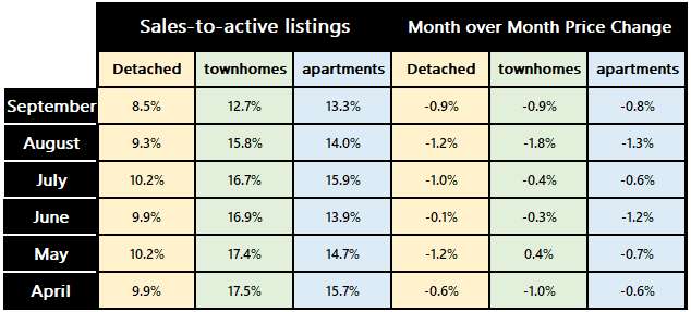 As you can see in the table below, prices across all housing categories declined month-over-month. This trend aligns closely with the sales-to-listings ratio (SLR) — the lower the ratio, the weaker the demand. September marked the third consecutive month of SLR declines across all three housing types.